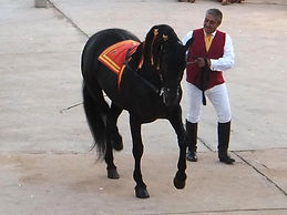 Caballos ataviados con los adornos típicos de las fiestas de Menorca y los jinetes con la vestimenta de fiestas. Hacemos una demostración de los movimientos típicos de la fiesta junto con los “bots menorquins” que se realizan en dichas fiestas patronales. Además de poder mostrar cómo enseñamos a los caballos a perder el miedo.